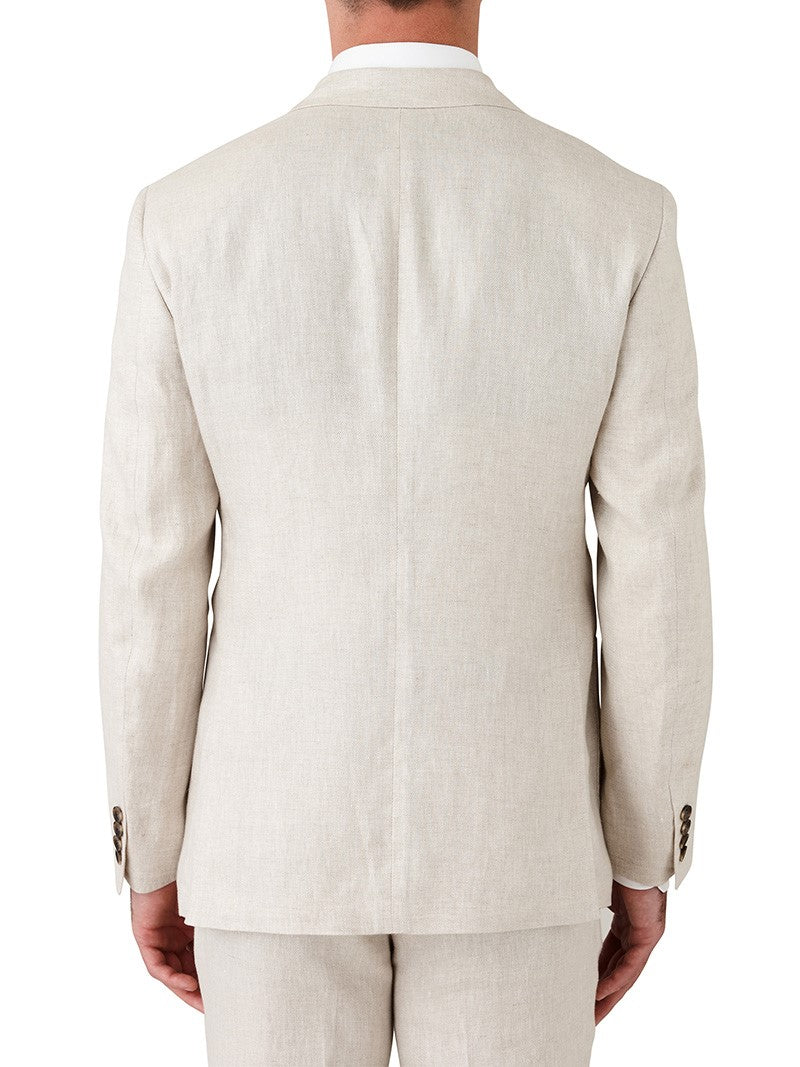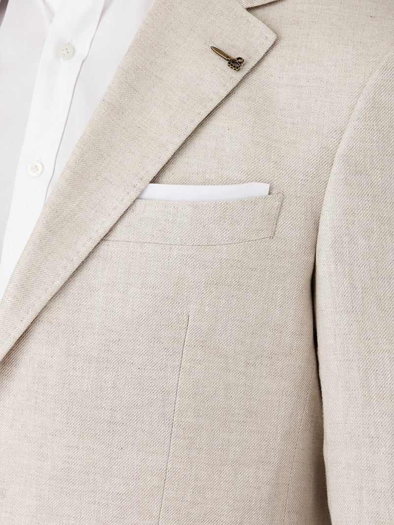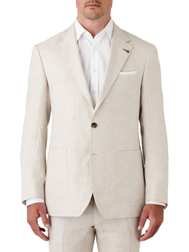 Designed in Australia, this Cruise jacket offers a tailored fit, natural shoulder and notch lapel. Crafted from 100% linen in a versatile sand colourway, its breathable nature and soft handfeel make it perfect for warm-weather events. Wear with a white shirt for ultimate Summer styling.