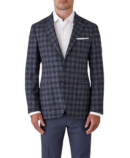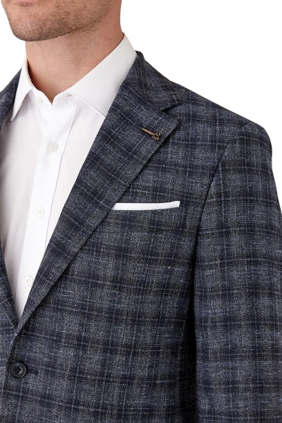A textured melange denim base with a dark navy overcheck. A versatile, tran-seasonal jacket. Fabric made in the Italian mill Marlane.