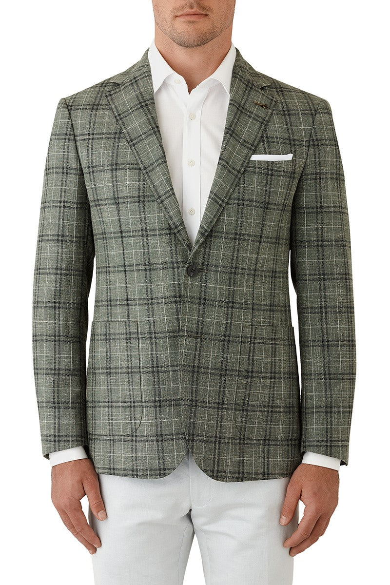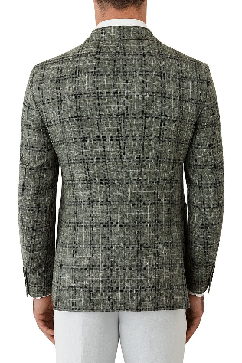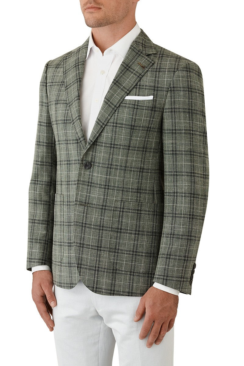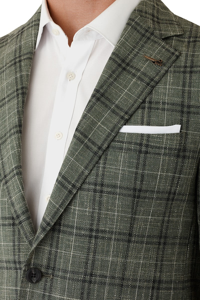 Crafted from a wool, cotton, and linen blend the Guard jacket is a Summer must have. With a tailored fit and natural shoulder, it offers a comfortable and stylish fit. The green linen-textured base with a dark green overcheck and white windowpane check adds a touch of sophistication. Made from natural fibres, it's a perfect choice for a refined and breathable wardrobe staple. Fabric woven at Italian mill, Marlane.