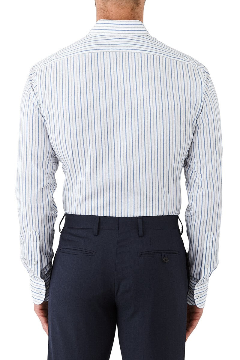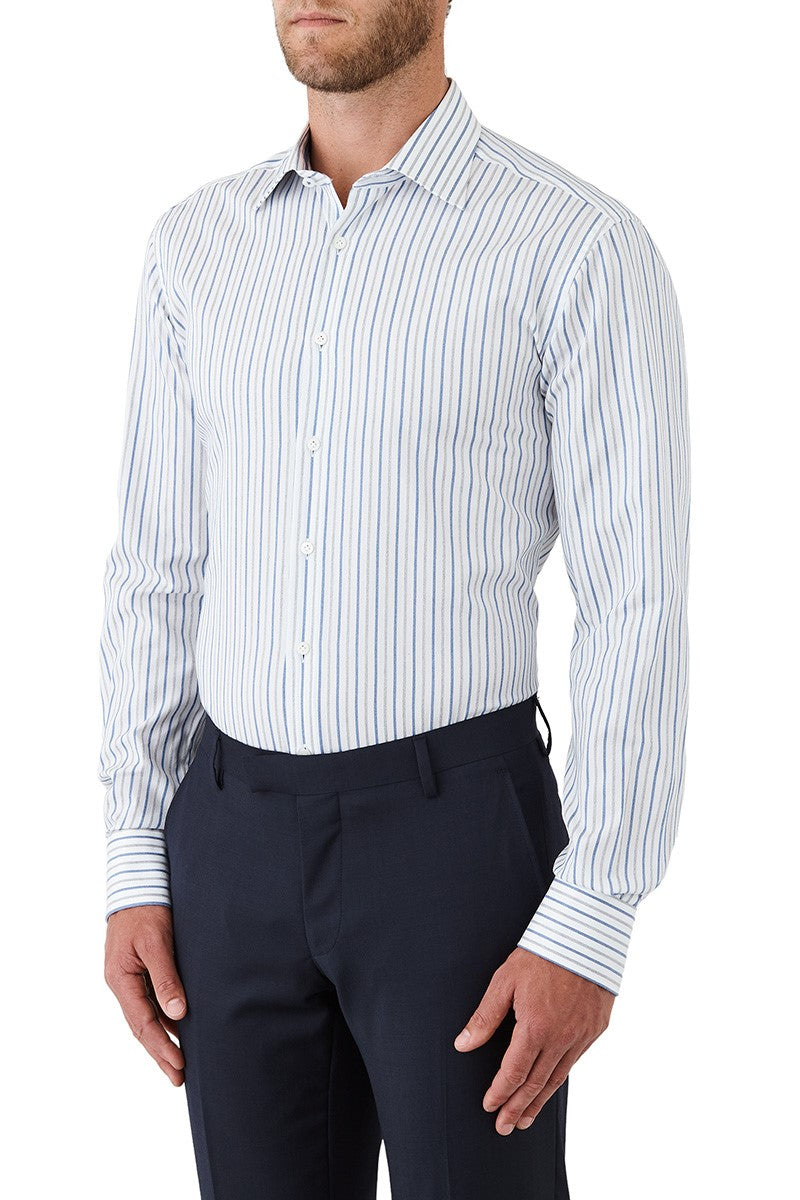 Designed in Australia the Joe Black Sentry Shirt is made from 100% Egyptian cotton with a tailored fit, semi-spread collar, and normal cuff. It features a white base fabric with a green and grey melange stripe, presenting a classic business shirt that pairs effortlessly with a variety of suits and sports jackets.
